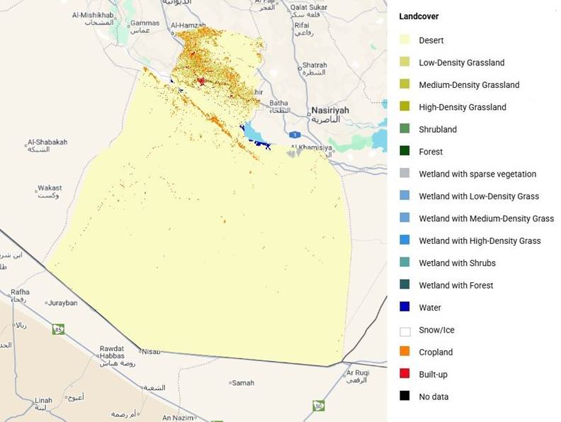 Al Muthanna is dominated by arid desert surfaces. Vegetated classes and cropland are limited in extent and are primarily concentrated in the northern part of the governorate and along localized water and irrigation features.
