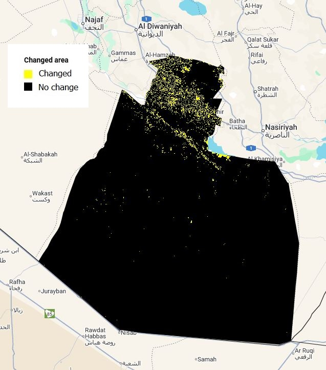 Figure 5. Land cover change map in Al Muthanna Governorate, 2000–2020 (changed vs. no-change pixels). (Full Resolution: Change map.JPG)