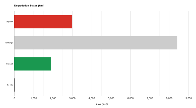 The land-degradation status layer classifies each pixel as Degraded, Improved, No Change or No Data based solely on land-cover transitions and their interpretation in the UNCCD SDG 15.3.1 framework.