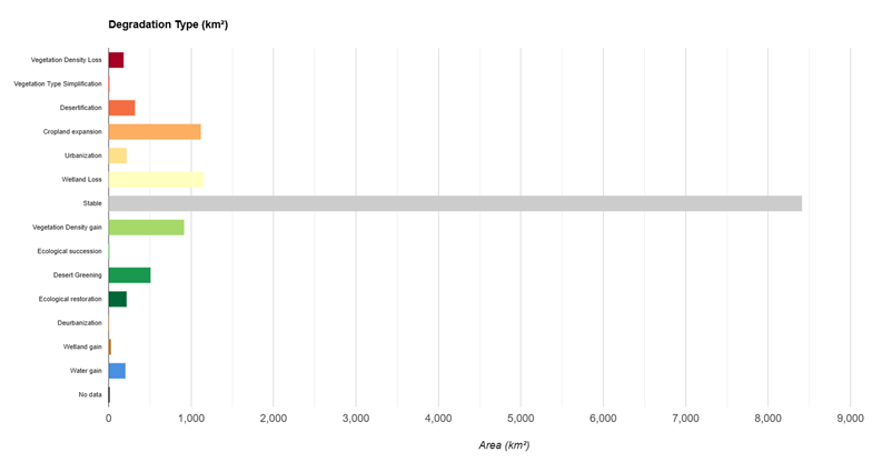 Figure 9. Land degradation and improvement types by area in ThiQar Governorate, 2000–2020. Full Resolution: Land Degradation type chart.png